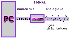Le modem est le périphérique utilisé pour transférer des informations entre plusieurs ordinateurs (2 à la base) via les lignes téléphoniques. Les ordinateurs fonctionnent de façon digitale, ils utilisent le langage binaire (une série de zéros et de uns), mais les modems sont analogiques. Les signaux digitaux passent d'une valeur à une autre, il n'y a pas de milieu, de moitié, c'est du Tout Ou Rien (un ou zéro). L'analogique par contre n'évolue pas "par pas", il couvre toutes les valeurs. ainsi vous pouvez avoir 0, 0.1, 0.2, 0.3 ...1.0 et toutes les valeurs intermédiaires.