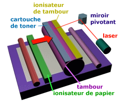 Le laser quant à lui (grâce à un miroir qui lui permet de se placer) charge le tambour positivement en certains points. Du coup, l'encre du toner chargée négativement se dépose sur les parties du toner ayant été chargées par le laser, qui viendront se déposer sur le papier.